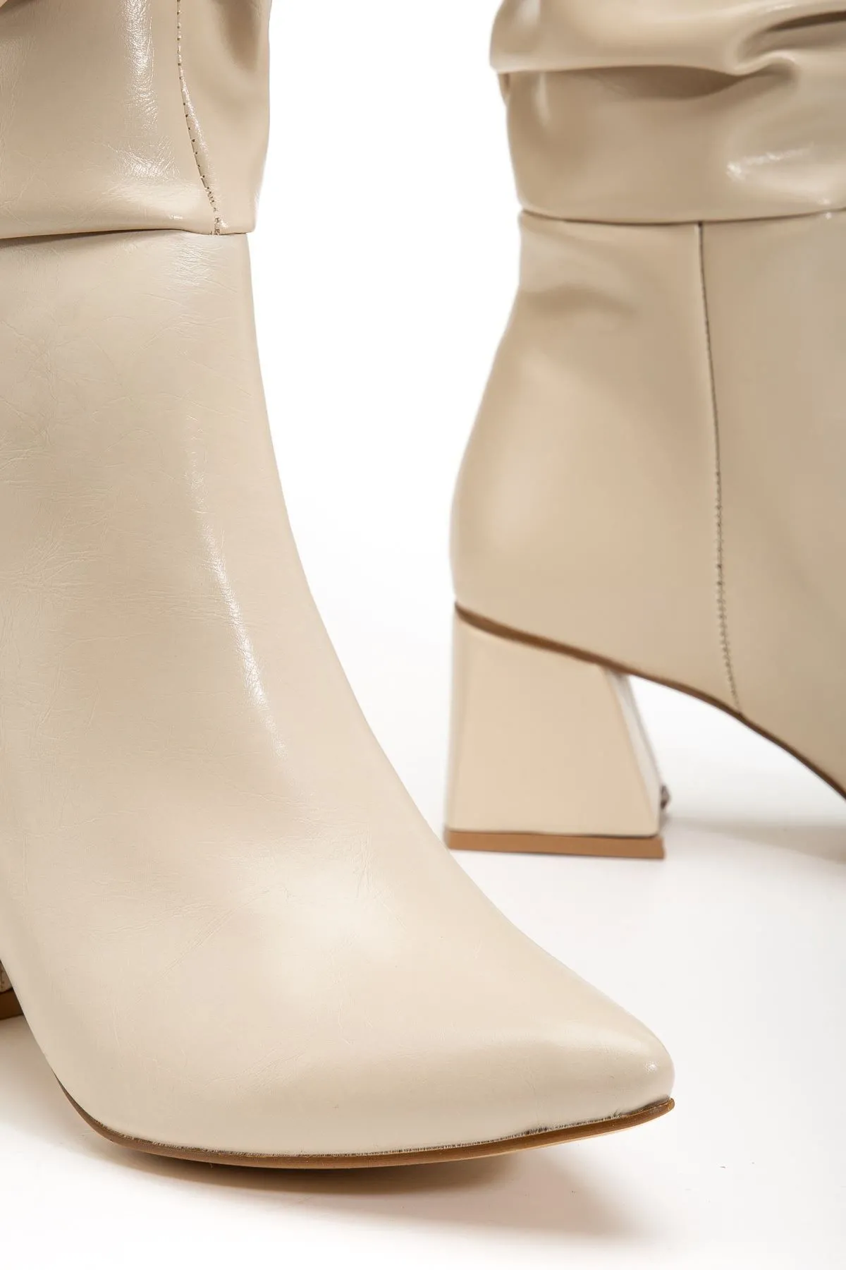 Syt-2002 Bej Kırışık Rugan Körüklü Kalın Topuklu Günlük Bayan Çizme